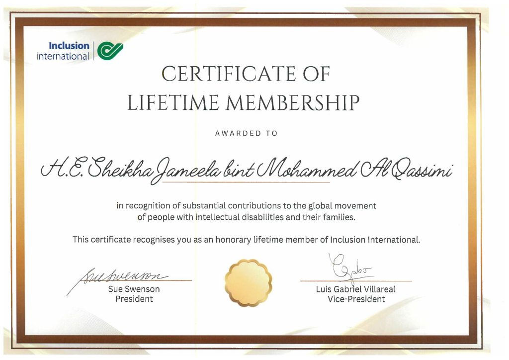وتمثل هذه الشهادة تكريماً دولياً رفيع المستوى من قبل المنظمة التي تعد أكبر شبكة عالمية تعنى بحقوق الأشخاص ذوي الإعاقة الذهنية وأسرهم، ما يضع الشيخة جميلة القاسمي في مصاف القيادات العالمية التي أثرت بشكل ملموس في دعم حقوق وتمكين الأشخاص ذوي الإعاقة الذهنية على مستوى المجتمع الدولي.