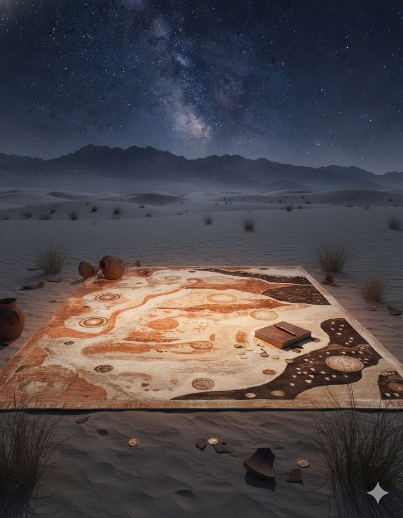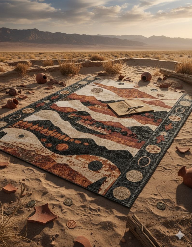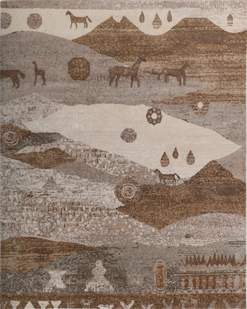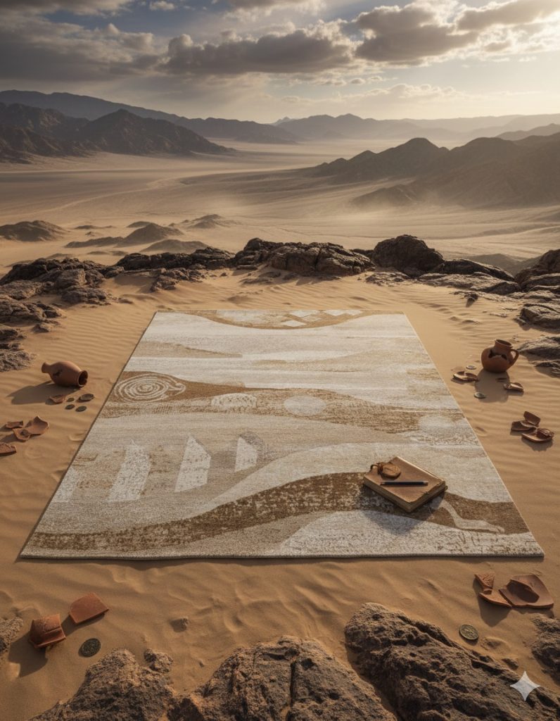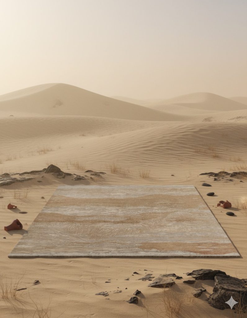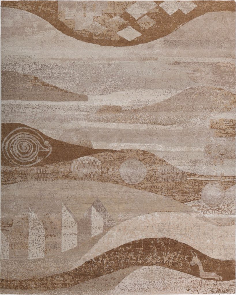 تقدّم هذه السجادة رؤيةً للصحراء كما لو أنّها تُطلّ علينا من وراء حجابٍ من الرمل والضوء، لتستحضر مشهداً يبدو مألوفاً وغامضاً في آنٍ واحد. ترتفعُ المعالم فيها كذكرياتٍ تُفصح بخفوتٍ عن ماضيها البعيد، موحيةً بملاذٍ وظلٍّ وقصصٍ لم تُروَ بعد. ورغم رقتها، فهي آسرةٌ بقوة حضورها، تدعونا إلى تأمّل ما هو خفيّ وما يستتر خلف سكون المشهد. إنها تلتقط جوهر الكثبان وسرّ تحوّلاتها الصامتة، حيث ينساب في كل خيطٍ نسيجيّ صدى الرياح وحركة الرمال، كأنها دعوة للتفكّر في لحظات التغيّر والعبور، وفي معنى الوجود، وفي تلك الطاقة العميقة والشعر الكامن في قلب الصحراء.