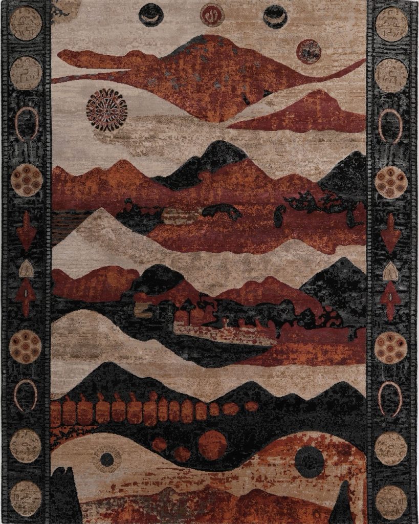 تنبض خيوط هذه السجادة بذاكرةٍ حيّة، كأن الزمن ذاته ينساب عبر تفاصيل نقشها. تتغيّر ملامح الجبل تدريجياً، وتتراجع الأشجار شيئاً فشيئاً، لتفسح المجال أمام زحف الصحراء الهادئ. ويظلّ الجمال حاضراً، لكنه يتبدّى هنا تحت سفح جبلٍ شامخ، في تحوّلٍ لطيف يعيد تشكيل المشهد والحياة معاً، مستحضراً إيقاع الطبيعة وحقيقة فنائها. ومع كل نظرة جديدة، تتكشّف طبقاتٌ أخرى من الحكاية؛ همساتٌ خفيّة وإصرارٌ ناعم للحياة وهي تتشبّث بوجودها في قلب التحوّل المستمر.