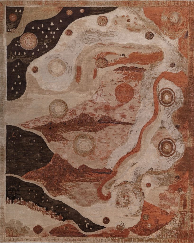 يستحضر هذا العمل لحظة التقاء الأرض بالسماء في مشهدٍ مهيب، كاشفاً عن أرضٍ يغمرها ضوء الليل الهادئ. تنساب عبر نسيجه دوّاماتٌ من الحركة والطاقة، فتوقظ أنماطاً تستدعي رقصة النجوم الحالمة، وتعيد إلى الذاكرة صعود التلال وهبوطها، وطيّات الوديان المستترة وحدودها المطمورة تحت الزمن. هنا تتآكل الجبال وتنكشف طبقاتها، وتتراجع البحار عن امتدادها القديم، وتنسحب الغابات وكأنها تفسح الطريق لبداية أخرى. ومع ذلك، يبقى كل خيط في السجادة نابضاً بالحياة، يوحي بدورة لا تنقطع. ومع كل نظرة جديدة، تتجلّى لحظة كشف صامتة— سجلٌّ للبدايات والعبور والشهادة— تجسّد أرضاً تقف عند مفترق الزوال والخلود في آنٍ واحد، حيّةً في الذاكرة كما في الخيال.