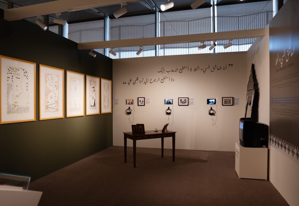 وضمن قسم “العاشق السيء الحظ” من المعرض، تقف سلسلة من الأعمال الفنية بعنوان: “تحية إلى محمود درويش” للنحاتة والشاعرة البصرية منى السعودي إلى جوار شاشاتٍ توثيقية تعرض مقاطع من الفيلم الوثائقي “محمود درويش، والأرض كأنها لغة” للمخرجة سيمون بيتون، وفيه تتحدث الكاتبة والمترجمة المصرية حياة الهيني عن علاقتها بالشاعر الراحل، حيث جمعهما زواج قصير لم يدم سوى أشهر، وانتهى بطلاق وديّ وصفه درويش بأنه “انفصال بسلام”.