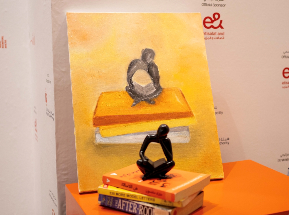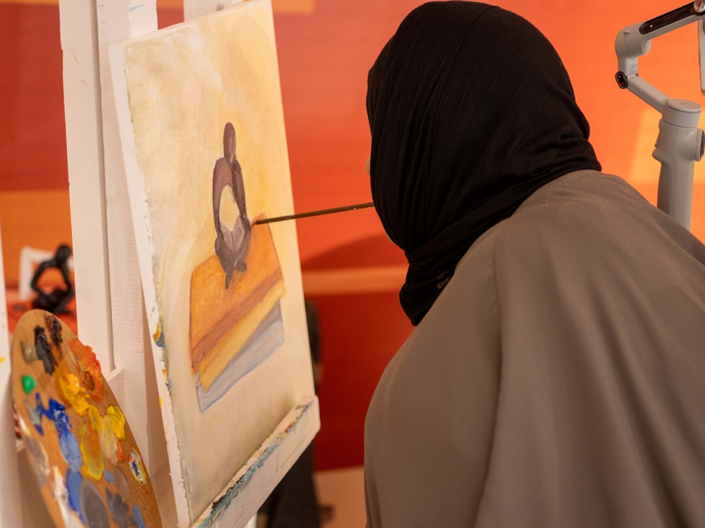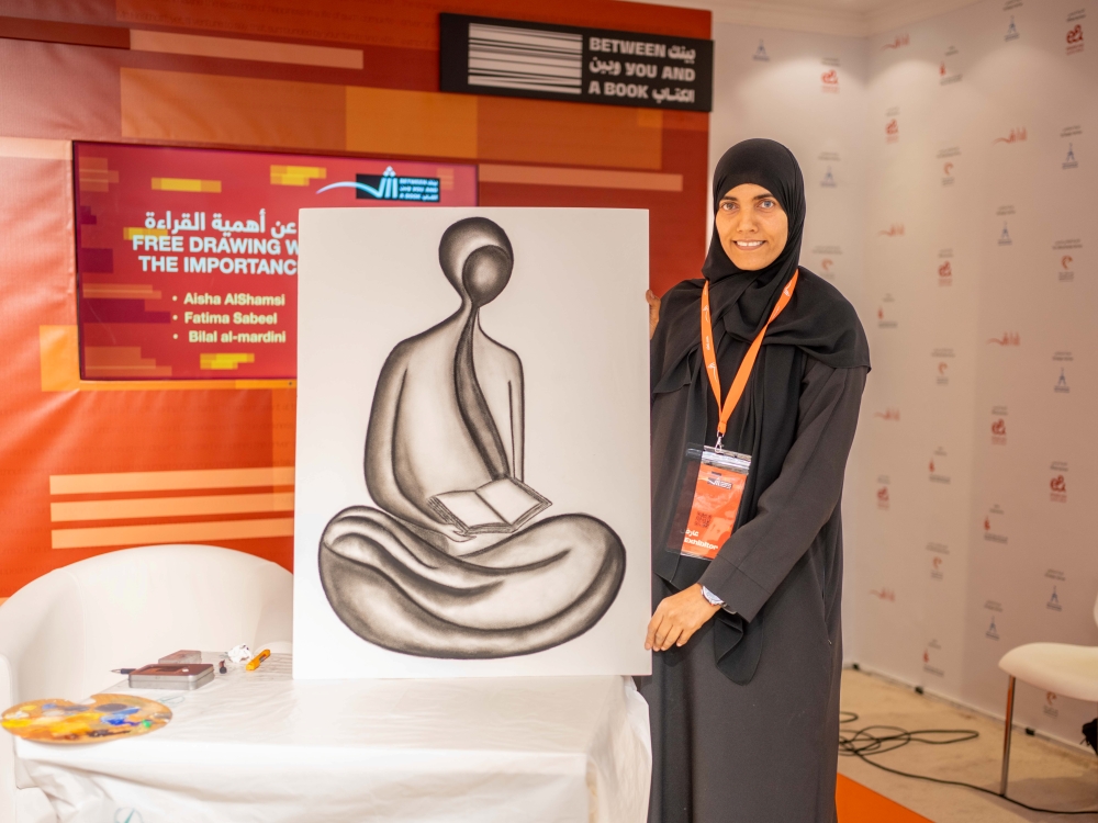 في البداية أمسكت عائشة الشامسي الفرشاة بفمها، لترسم بخطوطها وألوانها الزيتية لوحةً “لايف” تجسّد مفهوم القراءة بطريقة بصرية آسرة، كان النموذج أمامها تمثالاً صغيراً لشخصٍ يجلس في وضعية التفكير فوق مجموعة كتب، وكأنها بذلك تترجم فكرة القراءة كفعلٍ للتأمل والوعي، لا مجرّد عادةٍ يومية.