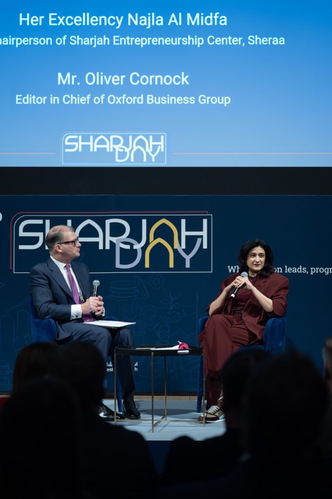 تلت ذلك جلسة حوارية بعنوان “معادلة الشارقة” شاركت فيها سعادة نجلاء المدفع، نائب رئيس”شراع”، وأوليفر كورنوك، رئيس التحرير في “مجموعة أكسفورد للأعمال”، وتناولت كيفية مزج إمارة الشارقة بين الابتكار وتمكين المجتمع والنمو الاقتصادي المستدام.